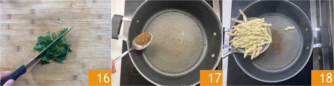 Pica el perejil 16. En la sartén donde has tostado los granos, con el fuego apagado, añade la pimienta molida a mano 17, luego escurre aquí los strozzapreti cocidos 18.