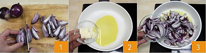 Para preparar la tagliata con cebollas agridulces, comienza pelando las cebollas rojas. Córtalas en 4 partes y luego en gajos más pequeños 1, luego toma una sartén antiadherente y calienta el aceite de oliva virgen extra, cuando esté bien caliente añade la mantequilla 2. Cuando la mantequilla se haya derretido, añade los gajos de cebolla roja 3 y deja sofreír suavemente.