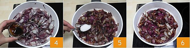 Cuando las cebollas rojas comiencen a ablandarse, agrega el vinagre balsámico 4 y el azúcar 5. Sala al gusto y deja guisar hasta que alcancen una consistencia blanda pero no deshecha 6.