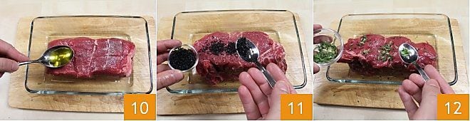 Transfiere la carne a una bandeja y añade el aceite 10, ayudándote con las manos para untar bien la pieza. Espolvorea la carne con la sal negra de Hawái 11 y con las hojitas de tomillo 12.