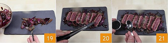 Forma una capa de cebollas caramelizadas en un plato 19 y coloca encima la tagliata 20. Decora con más sal negra de Hawái y hojitas de tomillo 21 y sirve inmediatamente tu tagliata con cebollas agridulces!
