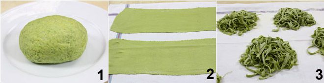 Para preparar los tallarines, sigue la receta de pasta verde que encuentras aquí con las cantidades indicadas en esta ficha. Cuando hayas obtenido una masa lisa y homogénea 1, déjala reposar cubierta durante al menos media hora en un lugar fresco. Extiende la masa 2 y forma los tallarines 3 (enrollándola y luego cortándola a mano siguiendo las instrucciones indicadas aquí, o utilizando la máquina adecuada).
