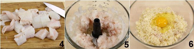 Mientras tanto, elimina las posibles espinas del pescado, córtalo en trozos 4 y pícalo con las cuchillas de un procesador de alimentos 5. Ponlo en un bol, añade el diente de ajo machacado, la miga de pan, el parmesano, el huevo 6, sal, pimienta (si lo prefieres),