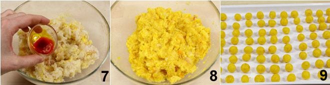 el azafrán disuelto en una cucharada de agua 7 y mezcla bien. Una vez obtenido un compuesto de color amarillo brillante 8, forma albóndigas muy pequeñas 9 (del tamaño de una canica de vidrio).