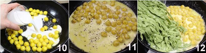 Pon en una sartén el aceite y la mantequilla y dora dos dientes de ajo que luego eliminarás; añade las albóndigas, saltéalas 2 minutos, luego desglasa con el brandy, añade la nata 10, ajusta de sal y pimienta 11 y luego apaga el fuego. Cocina los tallarines en abundante agua con sal y luego, una vez escurridos, añádelos a la sartén con el condimento 12. Salta todo durante un par de minutos, luego emplata repartiendo las albóndigas en los diferentes platos. ¡Feliz Día de la Mujer!