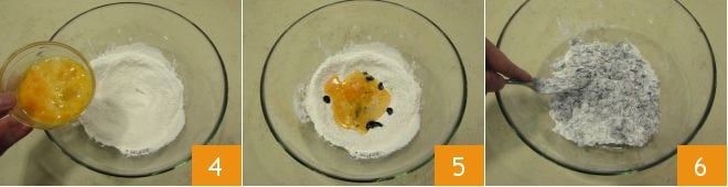 Pasa ahora a la preparación de la pasta. Toma un bol grande y coloca la harina tamizada. Añade a la harina los huevos 4 y el negro de sepia 5. Ayúdate inicialmente con un tenedor 6 para mezclar bien la masa.
