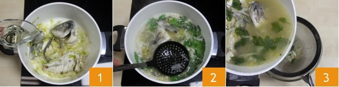 Para preparar los tagliolini al doble negro de sepia, comienza con la preparación del fumet de pescado. En una cacerola, sofríe en un poco de mantequilla el puerro cortado en rodajas, la cebolla cortada en cuartos y 1 diente de ajo, durante 5 minutos. Toma los desperdicios y únelos, dejando que se doren y añadiendo el vino blanco 1. Cuando el vino se haya evaporado completamente, añade el agua, la pimienta y el perejil, ajustando de sal. Deja hervir durante 60 minutos a fuego bajo, teniendo cuidado de espumarlo de vez en cuando ayudándote con una espumadera 2. Una vez cocido, filtra el caldo con un colador de malla fina para eliminar los desperdicios del pescado 3.