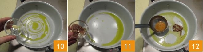 Pasa luego a la preparación de la salsa: toma una sartén, vierte el aceite y sofríe un diente de ajo entero 10. Cuando esté bien dorado, quítalo de la sartén. Añade las anchoas 11 y haz que se disuelvan añadiendo un poco de fumet 12.