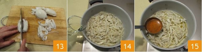 Ahora toma tus sepias (ya limpias y lavadas cuidadosamente bajo agua corriente). Elimina los tentáculos, luego córtalas en rodajas 13. Ponlas ahora en la sartén y saltéalas durante unos minutos a fuego vivo. Ahora rocía tus sepias con el vino blanco 14. Ajusta de sal y pimienta y moja con el fumet de pescado 15.
