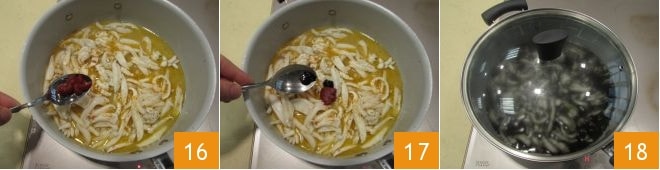 A las sepias, añade también el concentrado de tomate 16 y el negro de sepia 17. Mezcla, luego cubre la sartén con una tapa y apaga el fuego 18.