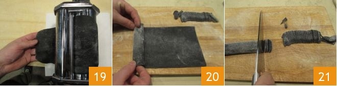 Ahora dedícate a la preparación de la pasta de huevo al negro de sepia. Retoma la masa, estírala ayudándote con la máquina para estirar la pasta, pasando del nivel más bajo al más alto para obtener una lámina muy fina, de aproximadamente 1 mm 19. Toma las láminas de pasta así obtenidas y pásalas con harina de sémola remolida (o con harina 00). Enrolla la lámina formando cilindros 20 y córtalas manteniendo un ancho de aproximadamente 2 mm 21. Así obtendrás tus tagliolini.