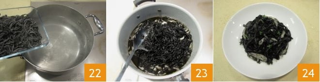 Sumerge tus tagliolini al negro de sepia por unos segundos en una cacerola con abundante agua salada a gusto 22 y luego escúrrelos inmediatamente. Vierte entonces los tagliolini a la salsita que has cocido con las sepias y mezcla bien para que los tagliolini absorban la salsa 23. Para terminar, decora tus tagliolini al doble negro de sepia con algunas ramitas de tomillo 24 y… ¡a disfrutar!