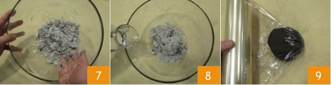Cuando los huevos y el negro de sepia estén incorporados en la masa, utiliza las manos 7 para mezclar todos los ingredientes. Añade agua a temperatura ambiente para homogeneizar mejor la masa 8. Amasa bien hasta que la mezcla esté sin grumos. Ahora haz una bola con la masa y cúbrela con film alimentario 9. Déjala reposar a temperatura ambiente durante aproximadamente media hora.