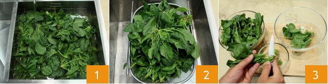 Para preparar los fideos de tortillas verdes con champiñones y speck, comienza lavando las espinacas cuidadosamente bajo agua corriente 2, para eliminar cualquier residuo de tierra. Escúrrelas 2 y corta cada manojo eliminando el tallo 3.