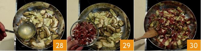mezcla y deja dorar a fuego fuerte. Luego añade un cucharón de agua caliente o Caldo de verduras 28 y cocina por 5 minutos. En este punto añade también el speck 29. Remueve de vez en cuando 30 y cocina todo por otros 5-10 minutos.
