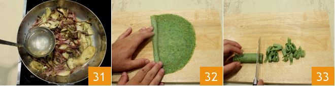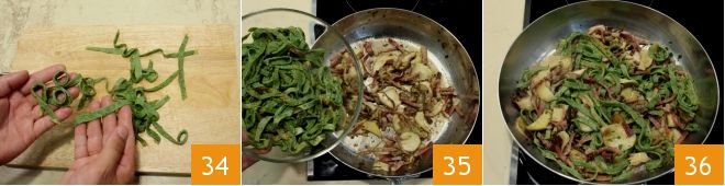 Después de saltear en la sartén unos aromáticos hongos porcini y suculentas tiras de speck, se añaden los fideos obtenidos de tortillas de huevos y espinacas, cocidos como si fueran crêpes saladas. De hecho, se puede usar la sartén específica para crêpes o una sartén antiadherente normal.