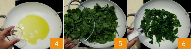 En una sartén grande, vierte un poco de aceite y el diente de ajo pelado 4. Déjalo dorar, luego quítalo y añade las espinacas 5. Déjalas marchitarse unos minutos y añade sal 6. Apaga el fuego cuando se hayan ablandado y reducido de volumen.