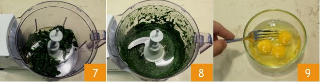 Luego transfiere las espinacas cocidas al procesador 7, acciona las cuchillas y reduce las espinacas a crema 8, luego resérvalas. Comienza a preparar la masa de las tortillas: en un bol pequeño vierte los huevos enteros 9.