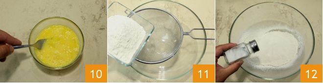 Bate los huevos con un tenedor 10 y resérvalos. Mientras tanto, en un bol grande tamiza la harina 11, añade la sal 12