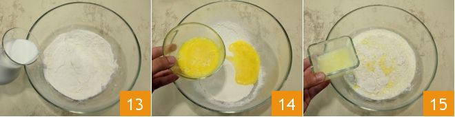 vierte la leche gradualmente 13 y luego los huevos previamente batidos 14. En un cazo derrite la mantequilla a fuego muy bajo; déjala templar y luego añádela a la masa de las tortillas 15.