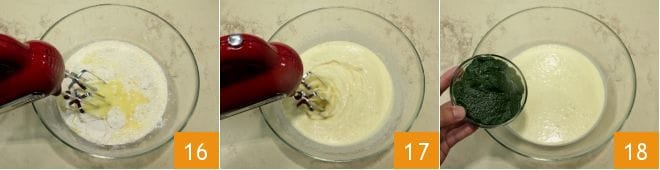 Trabaja la mezcla con una batidora eléctrica 16 o un batidor manual, hasta obtener una crema lisa y homogénea 17. Luego vierte en la mezcla también la crema de espinacas 18.