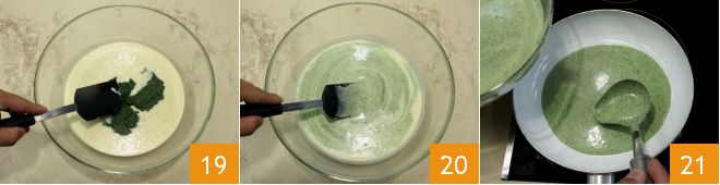 Mezcla con una espátula para incorporar la mezcla (19-20). Calienta una sartén para crêpes o una sartén antiadherente de 20 cm de diámetro; unta el fondo con mantequilla (ayúdate con un papel de cocina para untar uniformemente la sartén); luego vierte un cucharón de la mezcla 21.