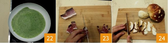 Deja cocinar la crêpe durante aproximadamente 1 minuto o hasta que el lado en contacto con el fondo de la sartén esté ligeramente dorado; durante la cocción, mueve la sartén de vez en cuando para despegar la crêpe del fondo. Luego dale la vuelta al otro lado 22 y cocina por otro minuto. Procede así hasta terminar la masa. A medida que vas cocinando, puedes apilar las crêpes en un plato plano y cubrirlas con film transparente mientras continúas con la preparación. Luego pasa al condimento: en una tabla de cortar coloca el speck, córtalo en lonchas y luego en tiras de aproximadamente medio cm de grosor y resérvalas 23. Luego pasa a limpiar los hongos porcini, quitando delicadamente la tierra rascando el tallo con un cuchillito, pasando luego un pincel de cocina y un paño para limpiar también el sombrero (para estas operaciones puedes consultar la Escuela de cocina: Cómo limpiar los boletus). Luego reduce los hongos a rodajas de medio cm 24.