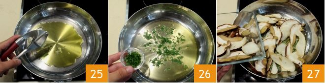 En una sartén grande, vierte un poco de aceite y pica un diente de ajo 25. Añade también el perejil previamente picado 26 y deja sofreír por un instante. Luego añade los hongos 27