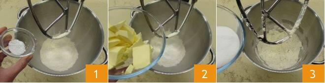 Para preparar la tarta amalfitana, en el bol de la batidora con el accesorio de pala, agrega la harina, la levadura en polvo 1 y la mantequilla fría de la nevera cortada en trozos 2. Trabaja durante unos minutos y luego añade también el azúcar 3