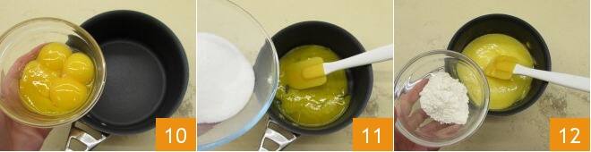 Mientras tanto, prepara la crema pastelera: en un cazo, vierte las yemas 10 y el azúcar 11, mezcla con la espátula y luego agrega también la harina 12.