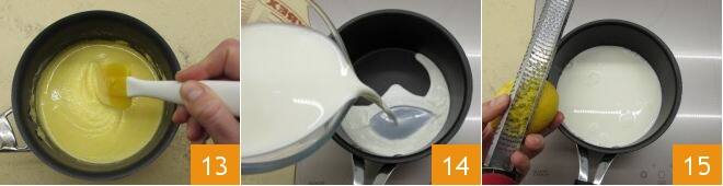 Mezcla hasta obtener una mezcla lisa y densa 13 y reserva. Ahora vierte la leche en un cazo 14, aromatiza con la ralladura de limón 15 y caliéntala en el fuego.