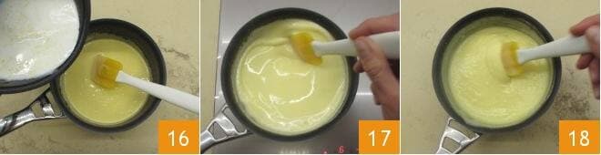 Cuando haya alcanzado el punto de ebullición, vierte primero una pequeña cantidad sobre la mezcla de huevos, mezclando con una espátula para atemperar 16, luego agrega el resto y mezcla bien. Coloca el cazo al fuego 17 y espesa la crema a fuego moderado, removiendo continuamente, hasta que esté cremosa y espesa 18.