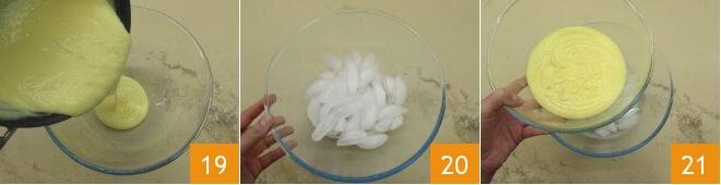 Transfiere la crema a un bol 19, llena otro bol más grande con cubitos de hielo 20 y coloca encima la crema 21