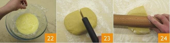Luego cúbrela con film transparente 22, de esta forma se enfriará rápidamente sin perder color ni consistencia. Una vez fría, deja que se solidifique en la nevera durante 1 hora. Pasado el tiempo necesario, recupera la masa, toma 2/3 del bollo 23 y estira con el rodillo 24