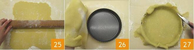 hasta un espesor de aproximadamente 3 mm 25. Transfiere la masa obtenida a un molde para tarta de 24 cm, preferiblemente con fondo desmontable 26. Haz que la masa se adhiera bien al fondo y a los lados, luego elimina la masa sobrante del borde 27.