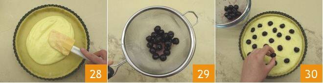 Rellena la tarta con la crema, distribuyéndola uniformemente con una espátula 28. Escurre las guindas de su almíbar 29 y colócalas de manera diseminada sobre la crema 30.