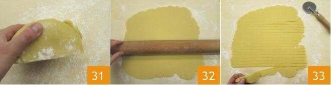 Recupera el resto del bollo y los recortes de masa 31, estíralo con el rodillo también a 3 mm de espesor 32 y corta tiras de aproximadamente 1 cm de ancho 33.