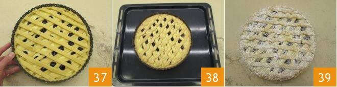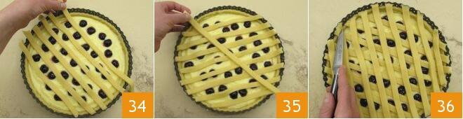 Coloca las tiras sobre la tarta en sentido oblicuo, superponiéndolas para crear un motivo de rombos (34-35). Corta con un cuchillo el exceso de masa del borde 36.