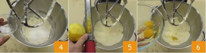 y la sal 4. Pon en marcha la máquina nuevamente y trabaja hasta obtener una mezcla harinosa y desmenuzada, luego aromatiza con la ralladura de medio limón 5 y agrega los huevos 6