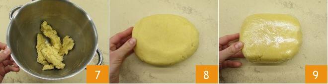 amasando hasta obtener una mezcla compacta y bien amalgamada 7. Luego, vierte la masa sobre la superficie de trabajo, trabaja ligeramente con las manos para formar un bollo 8 y cúbrelo con film transparente 9. Deja reposar en el frigorífico durante al menos 1 hora.