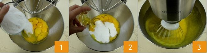Cuando el jarabe haya alcanzado los 121°, retíralo del fuego y, continuando montando las claras, añade el jarabe caliente en forma de hilo 16; deberás montar las claras con el jarabe 17 hasta que la mezcla esté completamente fría, para obtener un merengue suave 18.