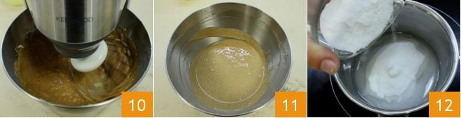 Monta juntos los ingredientes 10 hasta obtener una crema lisa y homogénea 11 que mantendrás a un lado, fuera de la nevera, pero en un lugar fresco, mientras continúas con la preparación. Dedícate entonces a la preparación del merengue italiano que se enriquecerá con la crema de avellana: en un cazo, vierte el agua y añade 75 g de azúcar 12. Enciende el fuego bajo y remueve de vez en cuando para disolver el azúcar.