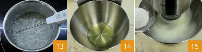 Controla la temperatura del jarabe con un termómetro para alimentos: no debe superar los 121°. Cuando llegue a 116° 13, puedes comenzar a montar las claras. Viértelos en el bol de una batidora 14 y móntalos añadiendo los 25 g de azúcar restantes 15.