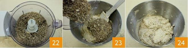 Pon en marcha el procesador y tritura finamente los barquillos 22 para luego agregarlos a la crema de avellana 23 que habías preparado, mezcla y reserva en un lugar fresco 24.