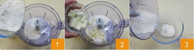 Para preparar la tarta con pesto mixto y panceta, comienza con la preparación de la masa quebrada. Coloca en un procesador de alimentos la harina 1, la mantequilla fría de frigorífico y cortada en trozos 2, una pizca de sal y mezcla todo hasta obtener una mezcla de aspecto arenoso y harinoso 3.