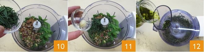Añade también los pistachos, el cebollino 10 y el diente de ajo 11, y acciona el procesador a intervalos, en lugar de continuo, vertiendo el aceite poco a poco 12.