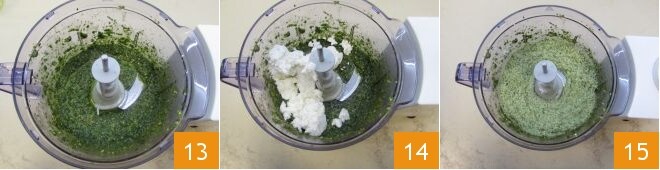 Una vez obtenido un pesto homogéneo 13, añade la ricotta 14 y acciona el procesador unos momentos más para amalgamar todo 15.