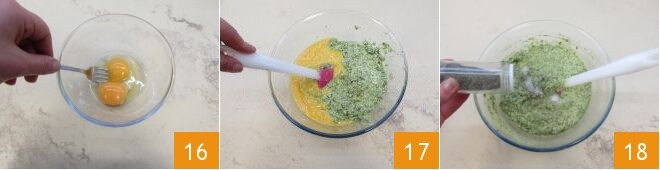 Aparte, en un pequeño bol, bate los huevos 16 y viértelos en el pesto recién preparado 17, añade sal y pimienta y mezcla nuevamente con una espátula 18.
