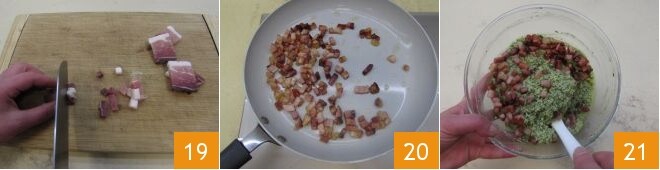 En este punto, corta la panceta en dados 19 y saltéala en una sartén, sin añadir nada, durante unos 5 minutos, hasta que esté crujiente 20. Déjala enfriar un poco, luego viértela en la mezcla de pesto 21.