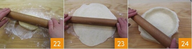 Pasados los 40 minutos, retoma la masa quebrada, colócala sobre una superficie de trabajo ligeramente enharinada y comienza a estirarla con el rodillo 22 hasta obtener un grosor de aproximadamente 1 cm 23. Luego, coloca la masa en un molde de tarta de 25 cm, previamente enmantequillado y enharinado, ayudándote arrollando la masa alrededor del rodillo y desenrollándola sobre el molde. Retira el exceso de masa, siempre ayudándote con el rodillo, presionándolo bien en los bordes del molde 24 y resérvalo.